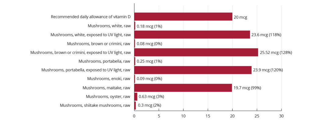 Mushrooms contain a plant sterol called ergosterol. Ergosterol coverts to vitamin D when exposed to UV light/ Sunlight. What that means? Mushrooms have a baseline level of Vitamin D but when exposed to the sun, the levels of vitamin D increase. We can therefore get additional vitamin D from mushrooms if we expose them to the sunlight before we eat or cook them. Next time you make a mushroom dish, consider sun-baking your mushrooms first to get the added vitamin D benefits.